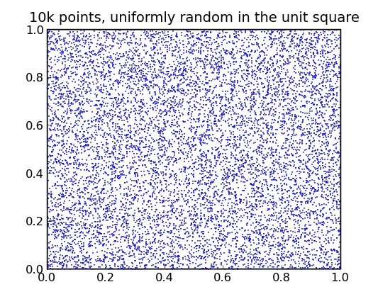 falls outside of the ball we want. Since the volume of the ball is much smaller than the volume of the cube, roughly 75% of these samples are rejected. (In the picture above, I jittered the points to reveal the duplicate points.)