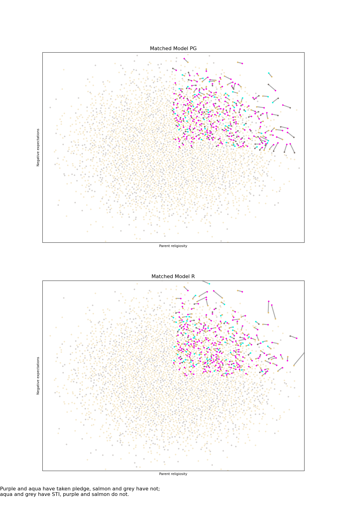 As above, each point represents a study subject. Purple and aqua have taken pledge, salmon and grey have not; aqua and grey have STI, purple and salmon do not. Pledgers and non-pledgers have been matched to minimize the total euclidean distance of the pairing.