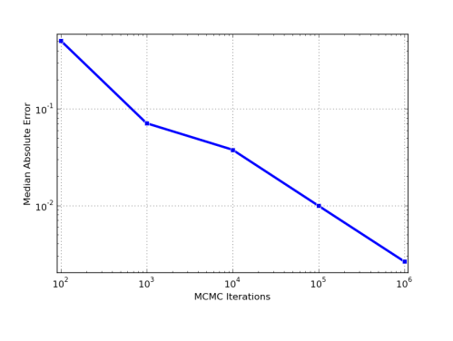 To make sure it is worthwhile, though, you need to convince yourself that the MCMC mixes, and that you have enough samples to an estimate with sufficient accuracy. Since the exact answer is easy to work out, this is a fun relationship to explore experimentally. Here is the relationship between the number of MCMC iterations and the median absolute error in the estimated probability of rain given wet grass over 10 replications: