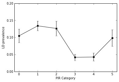 All the data is available on the CDC’s website, so I thought I’d take a look at it. Here is an interesting little plot that popped out: prevalence of parent-reported learning disabilities in 6-15 year olds as a function of income-to-poverty-line ratio.