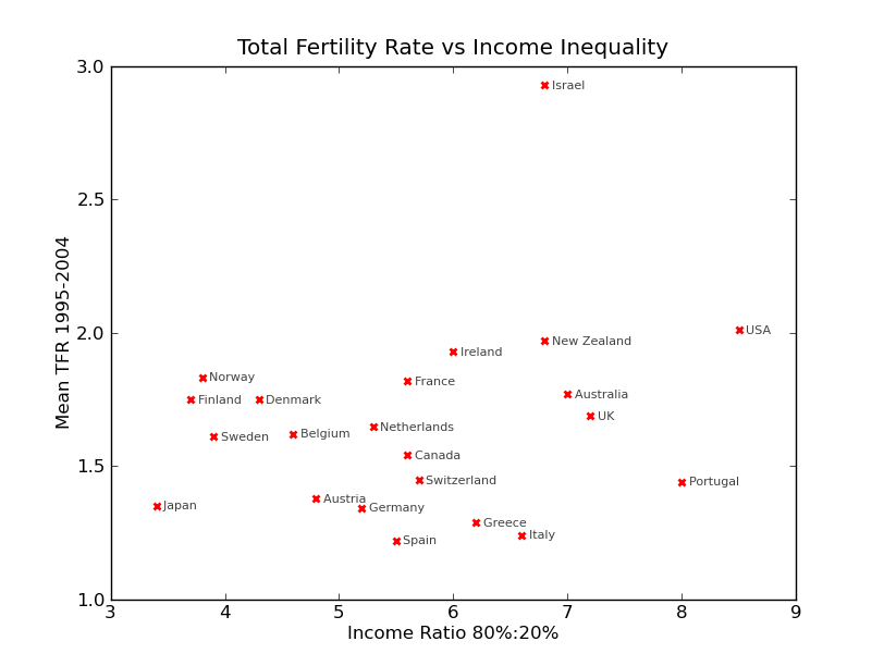 These plots seem like enough fun that I made my own, based on a question from the question and answer portion of the talk.  I’ve forgotten who, but someone in the audience asked “How is inequality related to total fertility rate?” and the answer from Wilkinson and Pickett was along the lines of “We never thought to check, how do you think it might be related?”