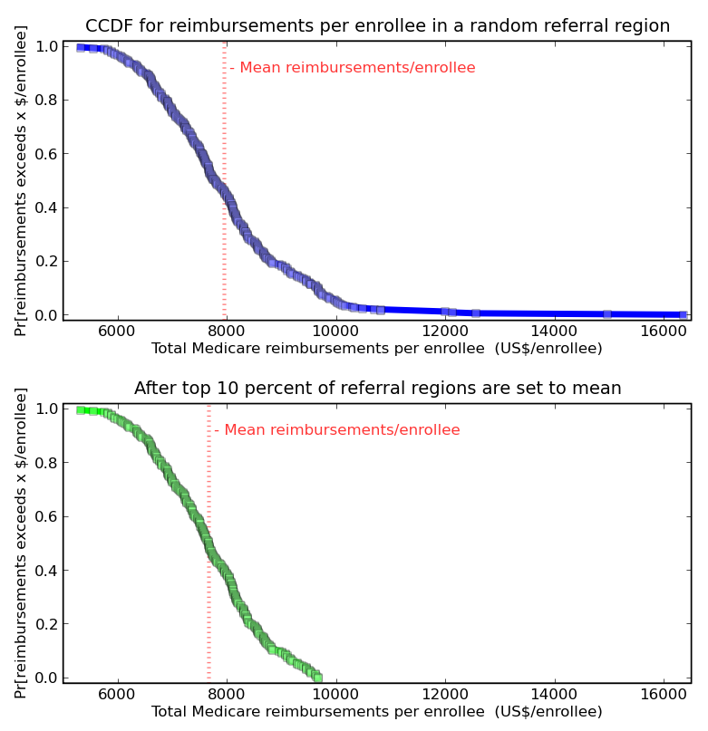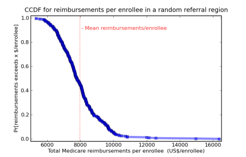 Look at this plot, which shows the complementary cumulative distribution function for the primary quantity in Gawande’s article, Total Medicare reimbursements per enrollee for 2006.