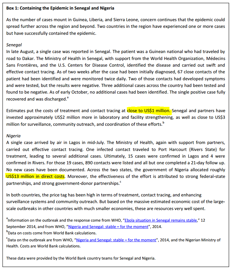 I want to save a bookmark to this little table in a big report on the economic impacts of Ebola in West Africa: World Bank country offices in Nigeria and Senegal produced estimates of the cost of successfully tracing contacts when responding to imported cases. Expensive, but worth it!