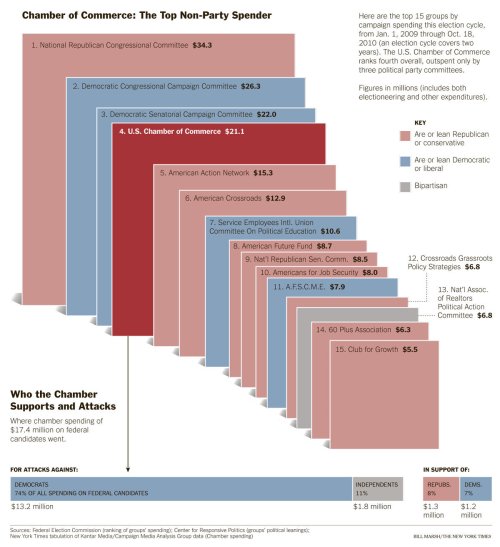 In Exhibit A, I draw your attention to the graphic from last week’s NYTimes front page article Top Corporations Aid U.S. Chamber of Commerce Campaign. The graphic on the web differs slightly from online, but both obscure the point: conservative groups are drastically outspending their rivals in the current election cycle.