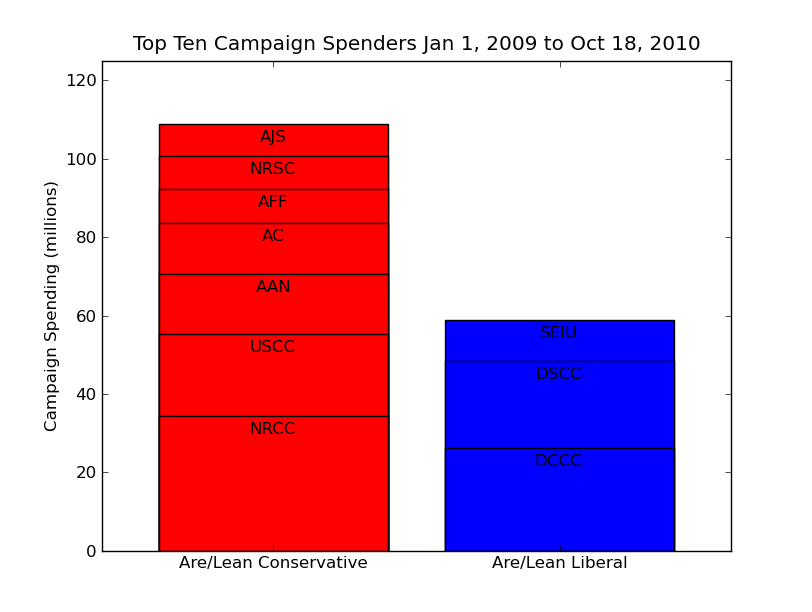 With a pro designer to work this over, the NYTimes could have a sexy front page infographic that’s meaningful, too. Look at that: among the top ten organizations, conservative spending is two times liberal. And if you pull out the “party spenders”, i.e. NRCC, NRSC, DCCC, DSCC, then conservatives are spending five times more. A picture is worth a large number of words, but we should still make them mean something.